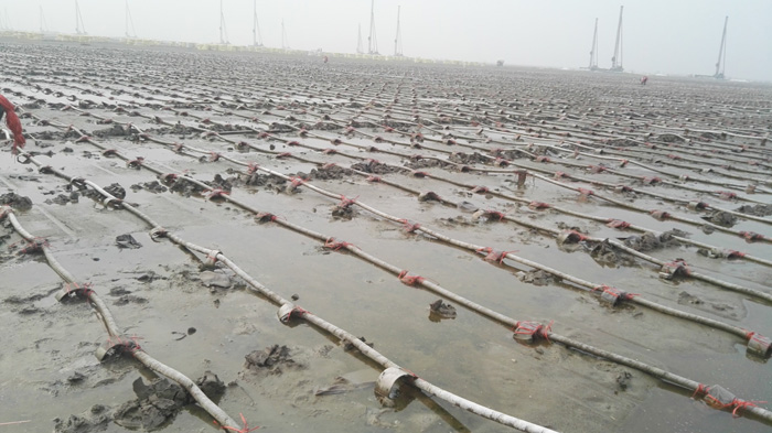 本工程于2014年8月15日人員進(jìn)場,8月21日進(jìn)行鋪砂,于2015年3月22日縱一路即EZ1和EZ2鋪設(shè)完畢。于2015年4月9日將全部區(qū)域鋪設(shè)完畢。隨后又于2015年4月12日和15日對A10區(qū)進(jìn)行一定厚度的補(bǔ)鋪。歷時238天將整個12個區(qū)域鋪設(shè)完畢。排水板正式打設(shè)時間為2015年4月22日,5月23日打設(shè)完畢,歷時32天。5月20日A10鋪膜完成,5月26日A7、A8、A9鋪膜完成,5月31日A3、A4鋪膜完成,6月4日A1、A2鋪膜完成。2015年10月18日和10月22日分別停止計時抽氣。本工程歷時433天完工。